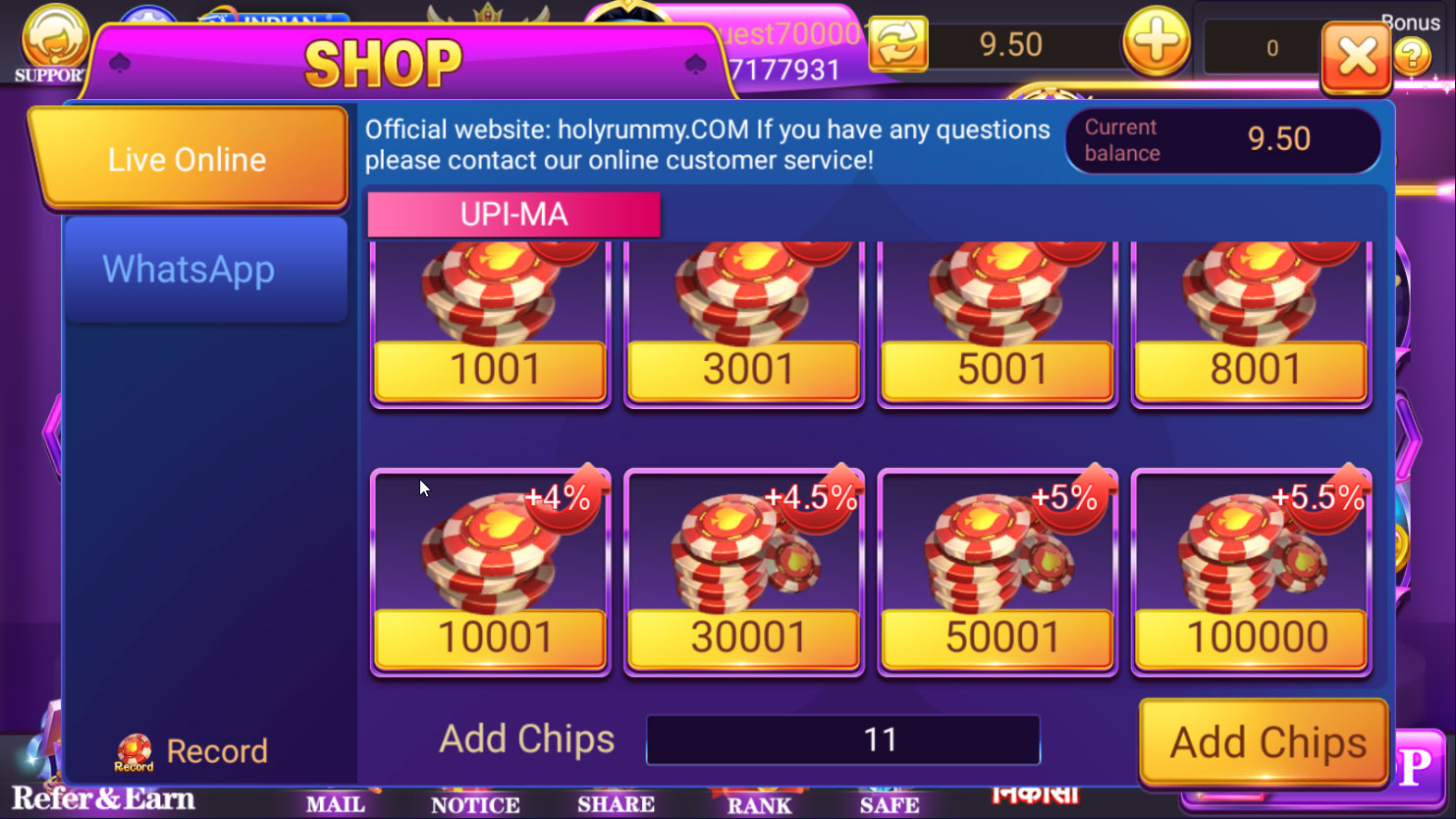 Select your Chip Pack. With a 1:1 ratio, for every ₹1 you pay, your account will be credited with 1 chip.